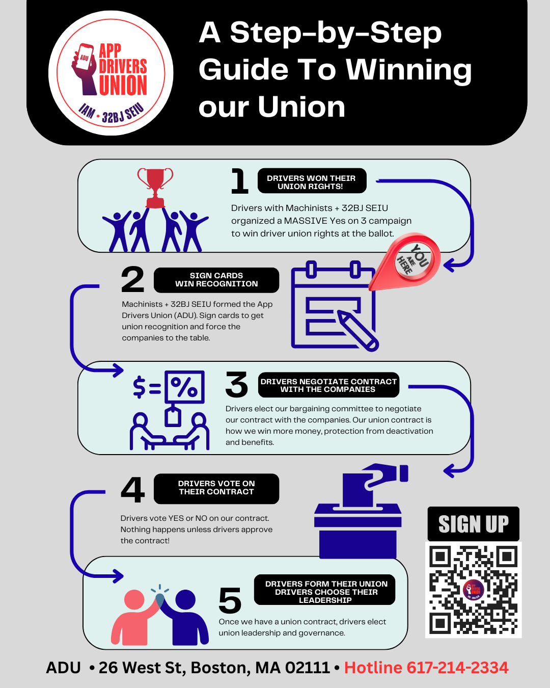 Thousands of drivers are signing cards to join the union. Once we have enough cards, the App Drivers Union will be officially recognized and the companies will have to sit down with us and bargain a contract that raises our pay and deals with deactivation.
